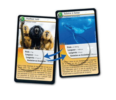 Chaque carte Défis Nature - Records des animaux est illustrée d’une photographie de l’animal dans son environnement naturel, de ses caractéristiques (« poids », « longueur », « longévité », « gestation ou incubation ») et contient du contenu éducatif pour en savoir plus sur l’espèce. Parfait pour apprendre en s’amusant !
